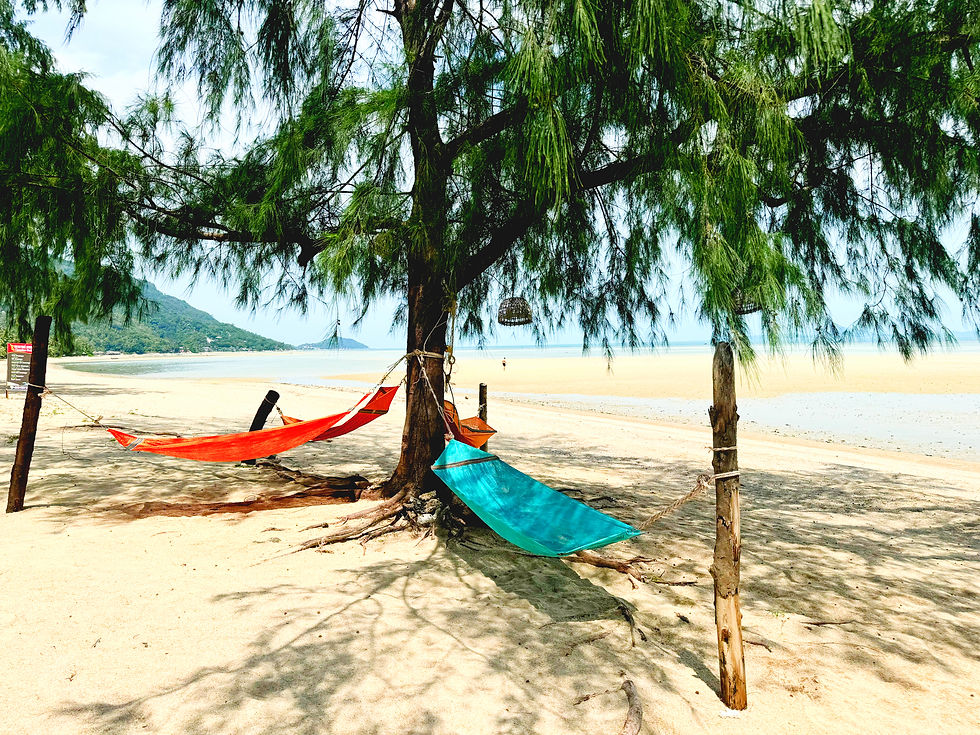 Relax in our ample beach seating and swaying hammocks, shaded by tall pines and swaying palm trees.